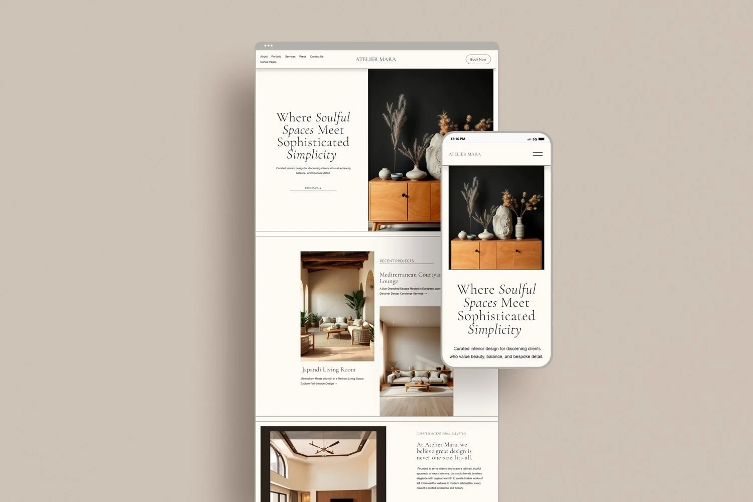 Atelier Mara – A layered, editorial layout perfect for storytelling and showcasing a refined portfolio.