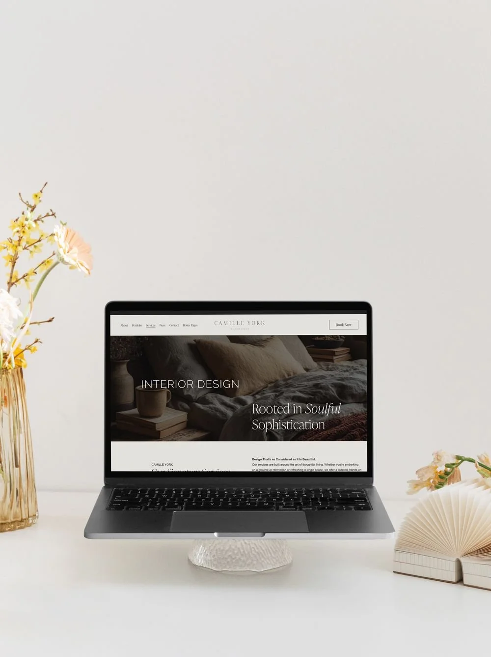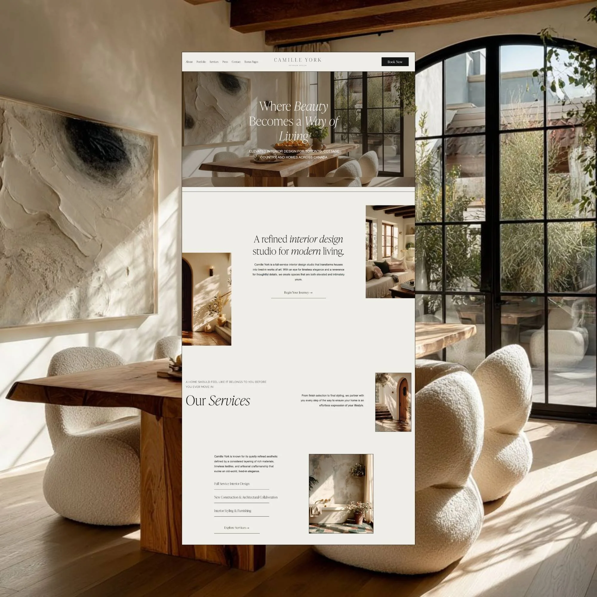 Camille York is an elevated Squarespace interior design portfolio template designed to showcase your work with warmth and clarity. Featuring an editorial layout with layered images, soft neutral palettes, this template helps you present your projects as stories, not just images. Effortlessly display your services, share client testimonials, and guide visitors through a beautifully organized portfolio that feels refined yet approachable. Perfect for interior designers, homestagers, stylists, and architects.